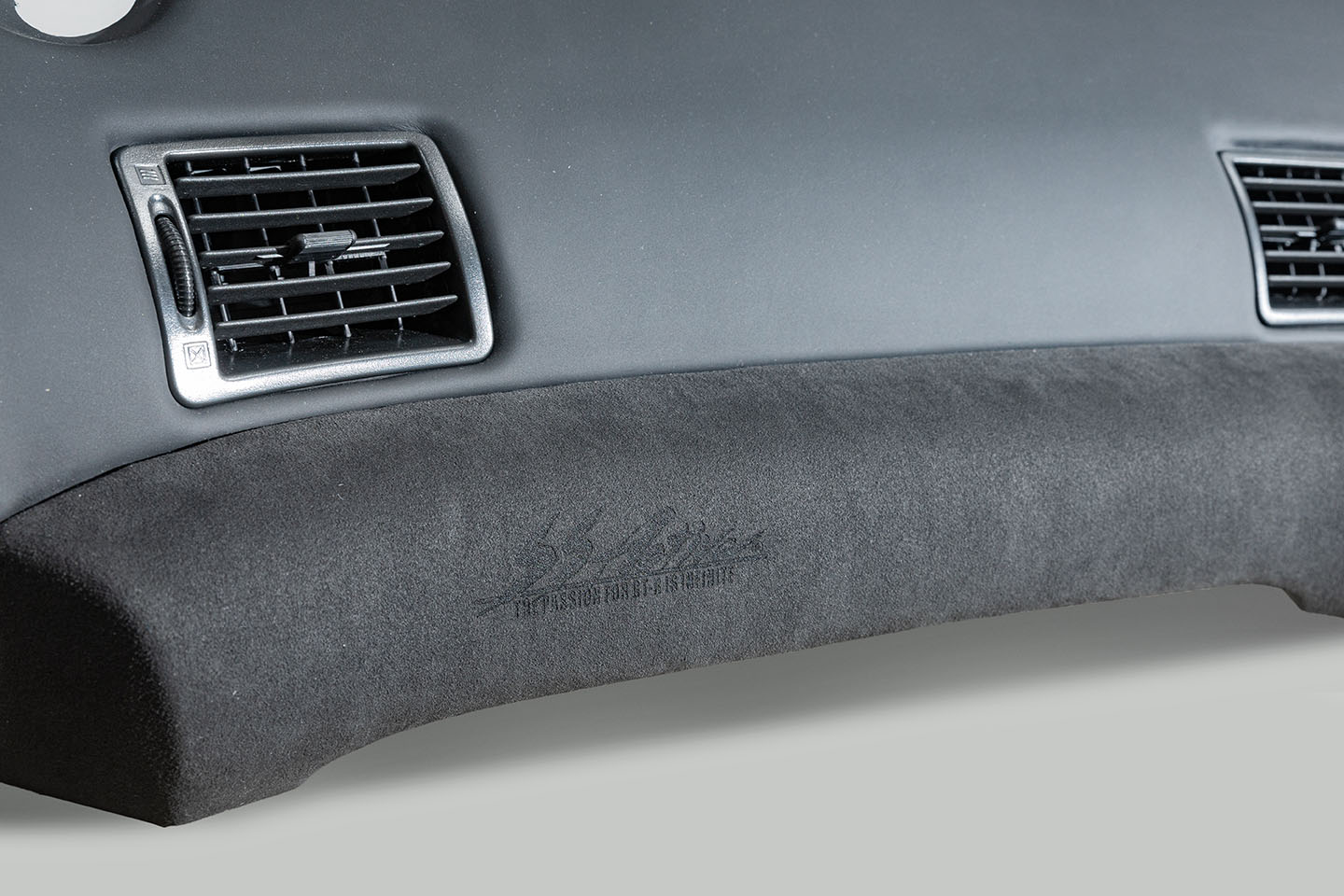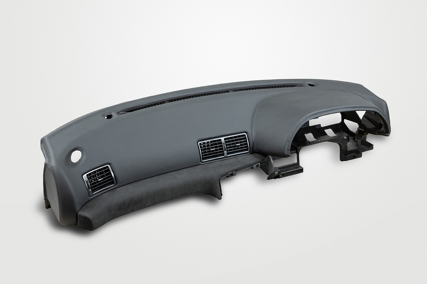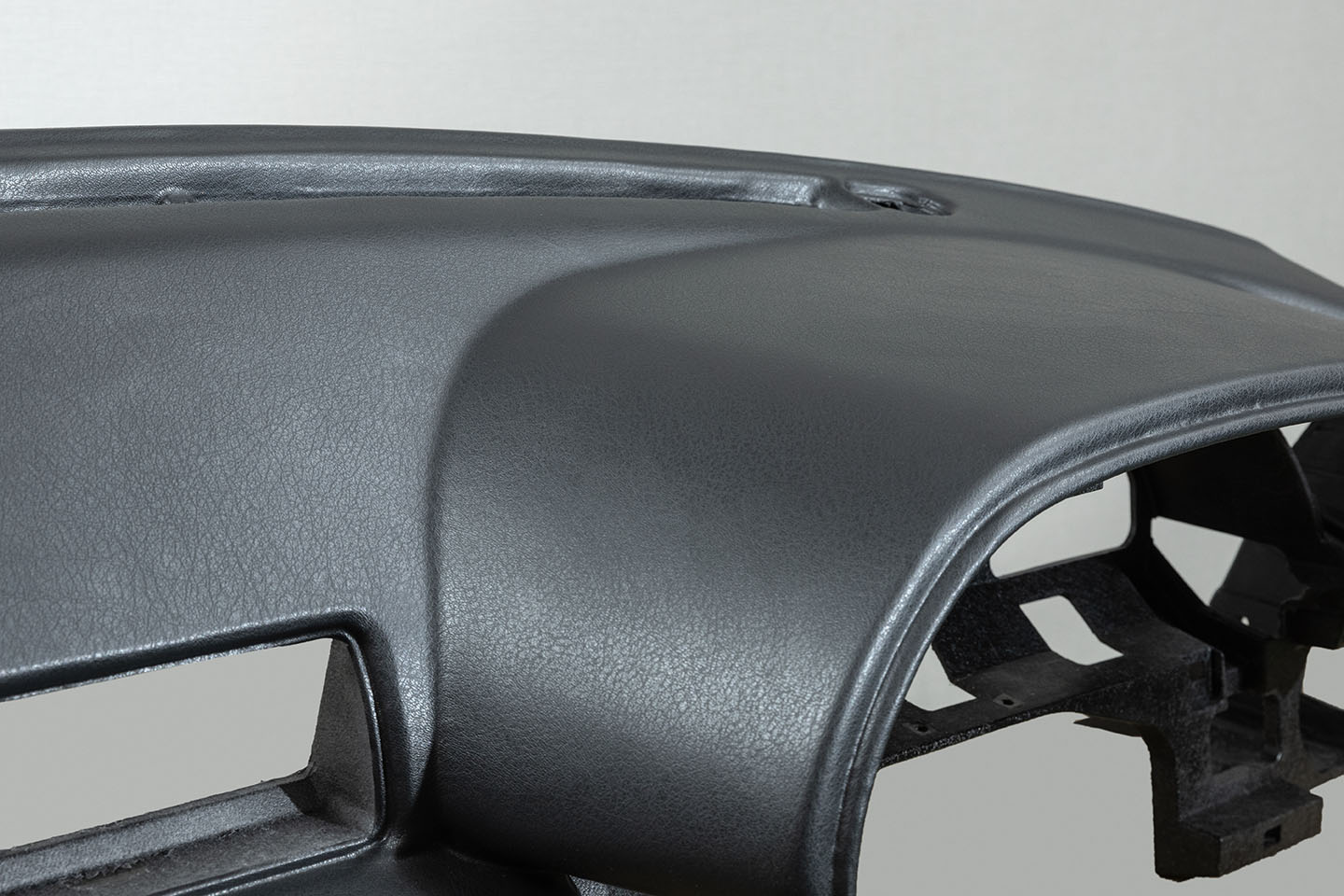 R32用のダッシュボードを現代の技術で復刻いたしました。本製品は、ベースフレームを新規金型の樹脂で成形。その上に衝撃緩衝材と表皮を装着しています。純正ダッシュボードで浮きが発生しやすいエアコンダクト下部の水平ラインに関しては、内部を2ピース構造とすることで解決を図っています。表皮は難燃性の高い素材のみを使用しており、日本の保安基準にも適合するスペックで仕上げました。