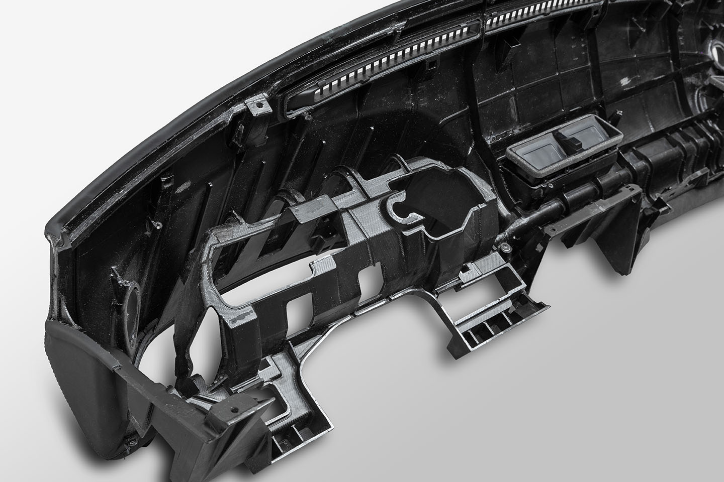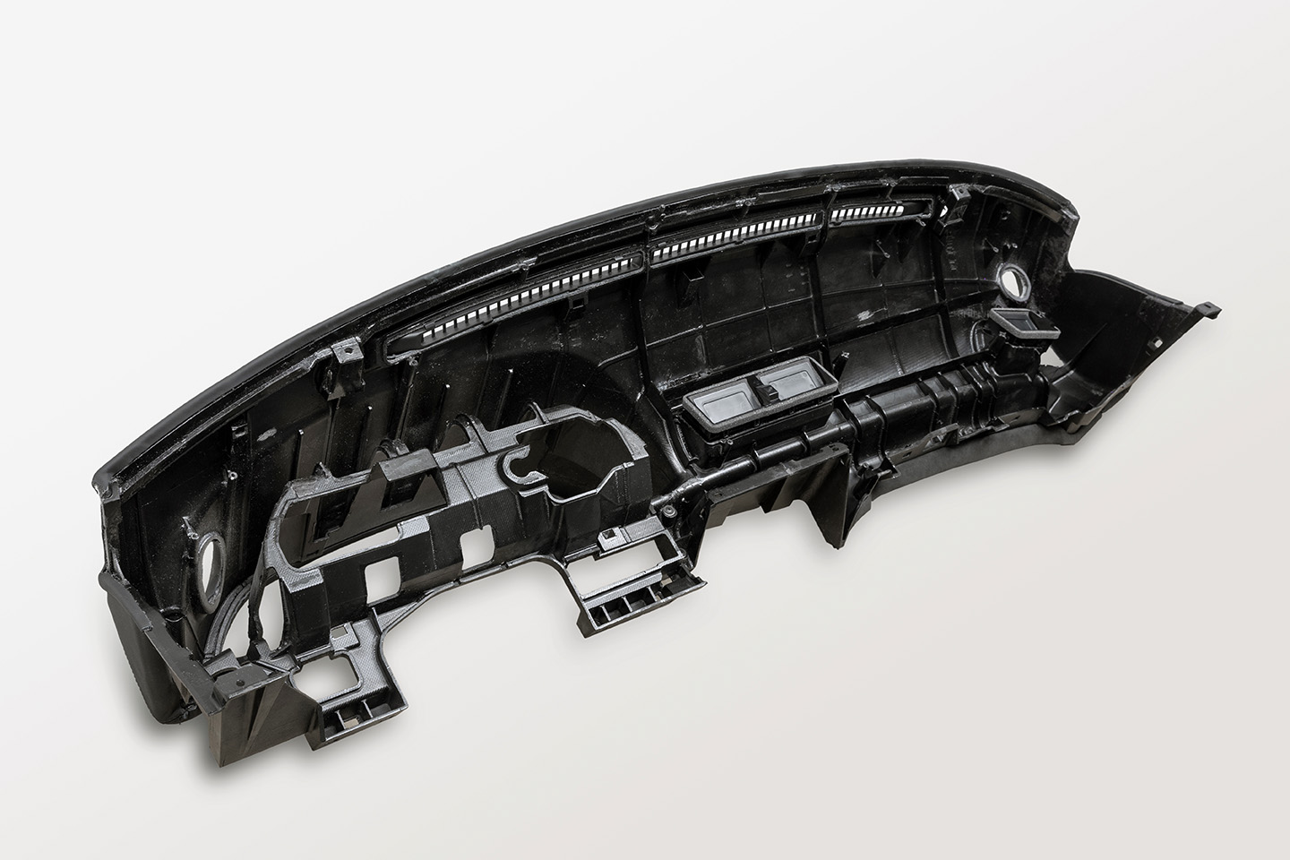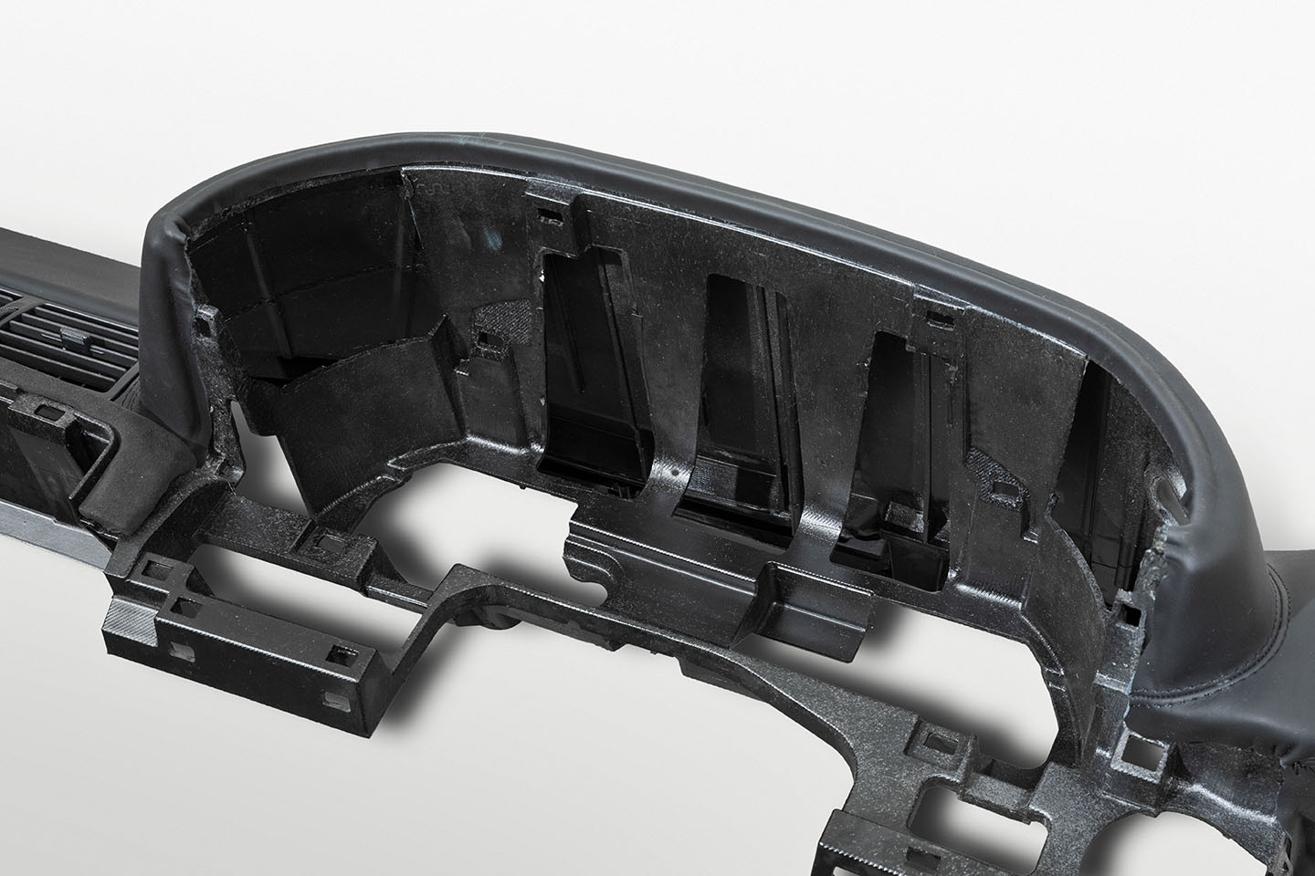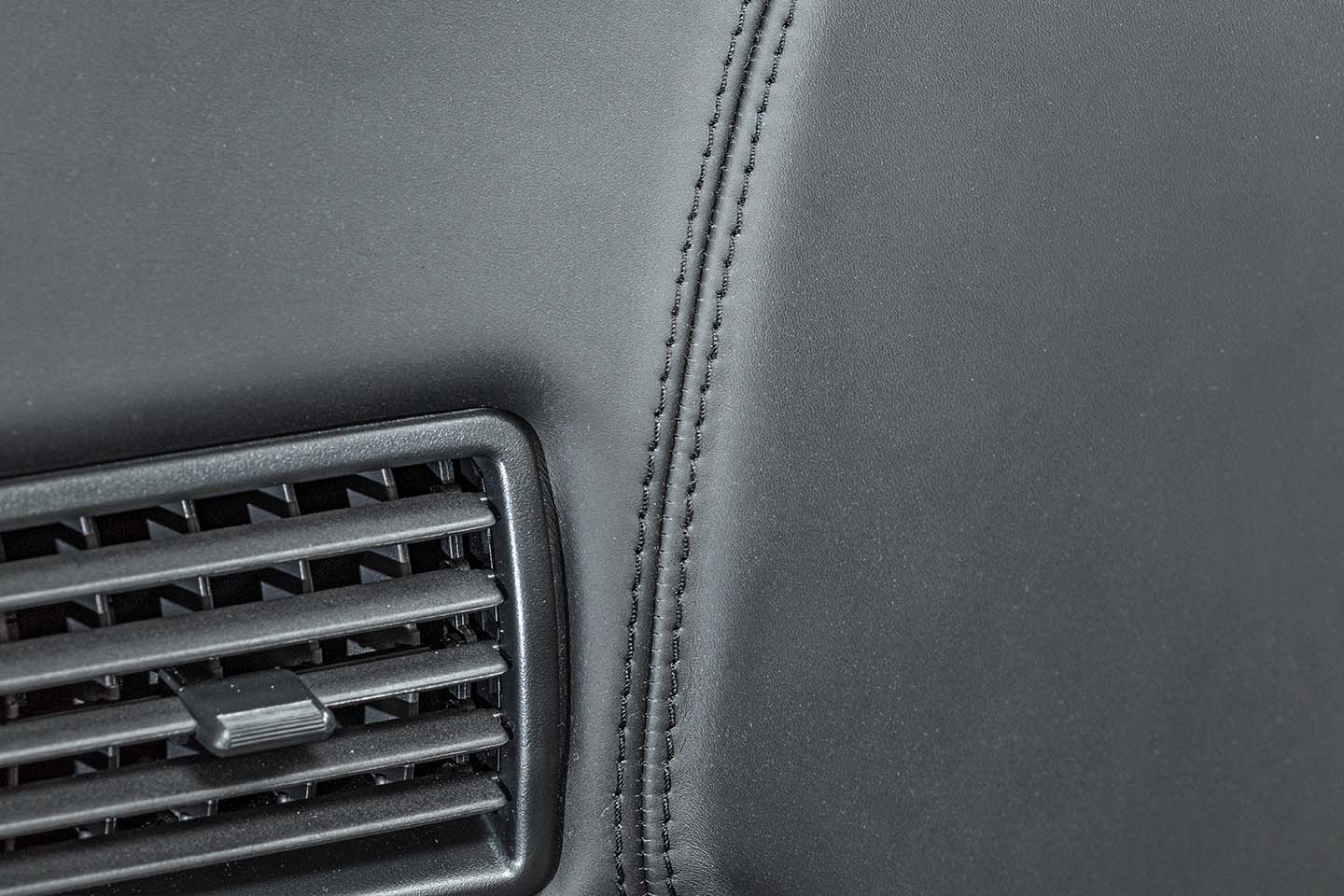 R32用のダッシュボードを現代の技術で復刻いたしました。本製品は、ベースフレームを新規金型の樹脂で成形。その上に衝撃緩衝材と表皮を装着しています。純正ダッシュボードで浮きが発生しやすいエアコンダクト下部の水平ラインに関しては、内部を2ピース構造とすることで解決を図っています。表皮は難燃性の高い素材のみを使用しており、日本の保安基準にも適合するスペックで仕上げました。